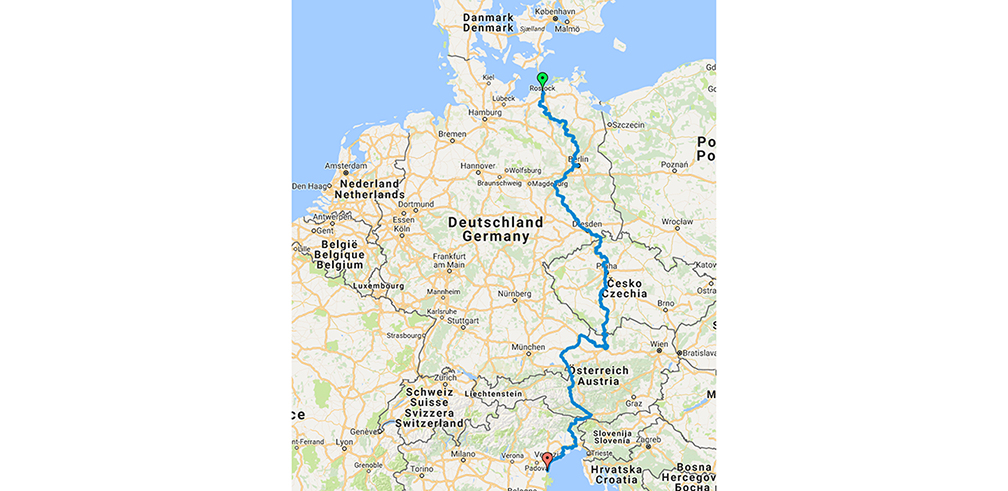 Cykelturen startar i Trelleborg med färjan till Rostock. Här hoppar vi direkt på Eurovelo 7 genom Tyskland. Eurovelo 7 kallas också solrutten och är 7,400 km lång. Den startar i Nordkap och slutar på Malta. Vi följer tidvis D-route 11, Elbe Radweg, lätt och för det mesta helt plan cykelled. Passerar i utkanten av Berlin och genom Potsdam. Rekommenderade stop; Wittenberg